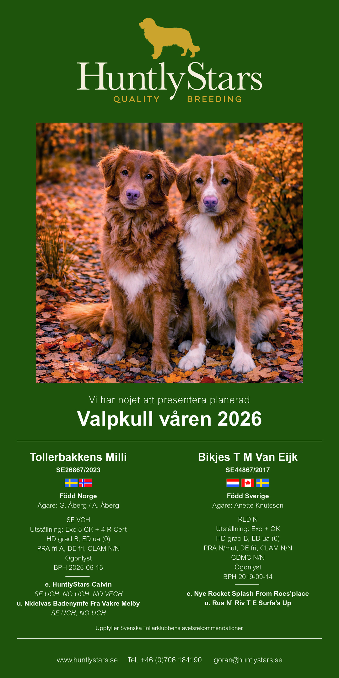 Inom Svenska Tollarklubben pratas det mycket om genetisk mångfald och vikten av att stärka den svenska genpolen för Tollare. Därför är vi extra glada att kunna presentera vår nästa planerade valpkull våren 2026!